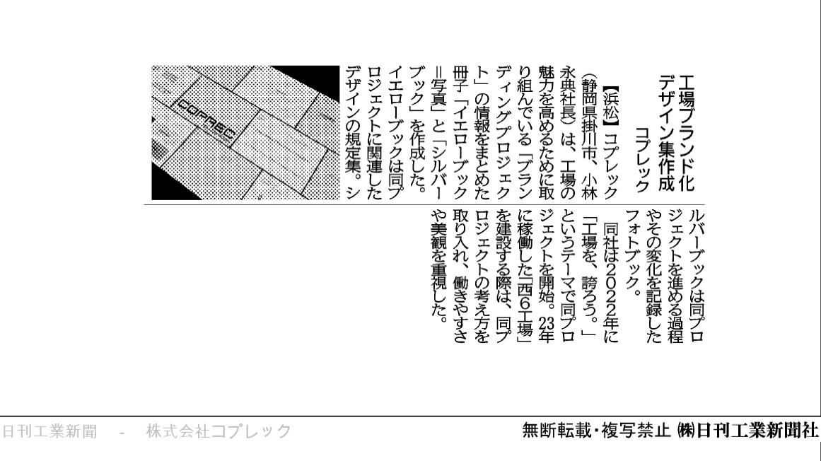 2022年から当社が取り組んでいるブランディングプロジェクトの基盤となるデザイン基準をまとめたイエローブックと、ブランディングプロジェクトの骨格づくりである第1フェーズをまとめたフォトブックであるシルバーブックが、日刊工業新聞に掲載されました。