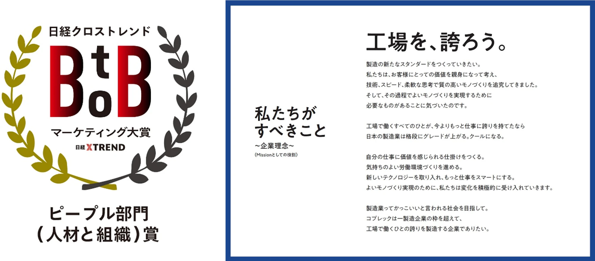 精密板金総合加工事業を行う株式会社コプレック(静岡県掛川市、代表取締役社長 小林永典、以下コプレック)は、現在取り組んでいるブランディングプロジェクト「工場を、誇ろう。」で、株式会社日経BP(東京都港区、社長CEO井口 哲也)、が発行するマーケティング情報を扱うオンラインメディア「日経クロストレンド」が主催する「日経クロストレンドBtoBマーケティング大賞」のピープル部門(人材と組織)で部門賞を受賞しましたことをお知らせします。なお、2024年7月23日から開催される日経クロストレンドFORUM 2024※にて全5部門の部門賞を受賞した5社によるプレゼン大会が行われ、大賞の1社が決定する予定です。