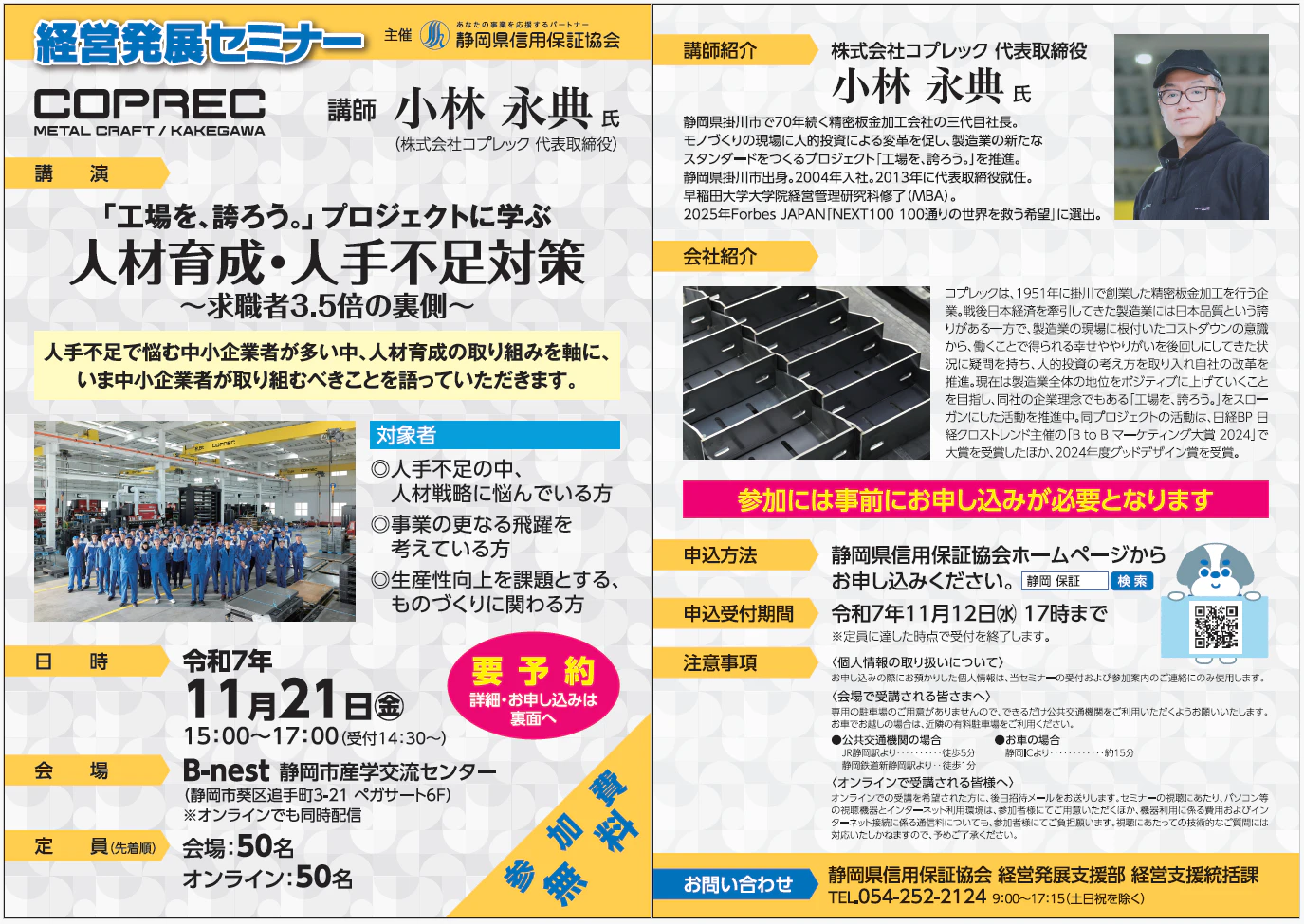 静岡県信用保証協会主催のイベントに代表取締役の小林永典が登壇します。弊社の人材育成の取り組みについてお話させていただきます。